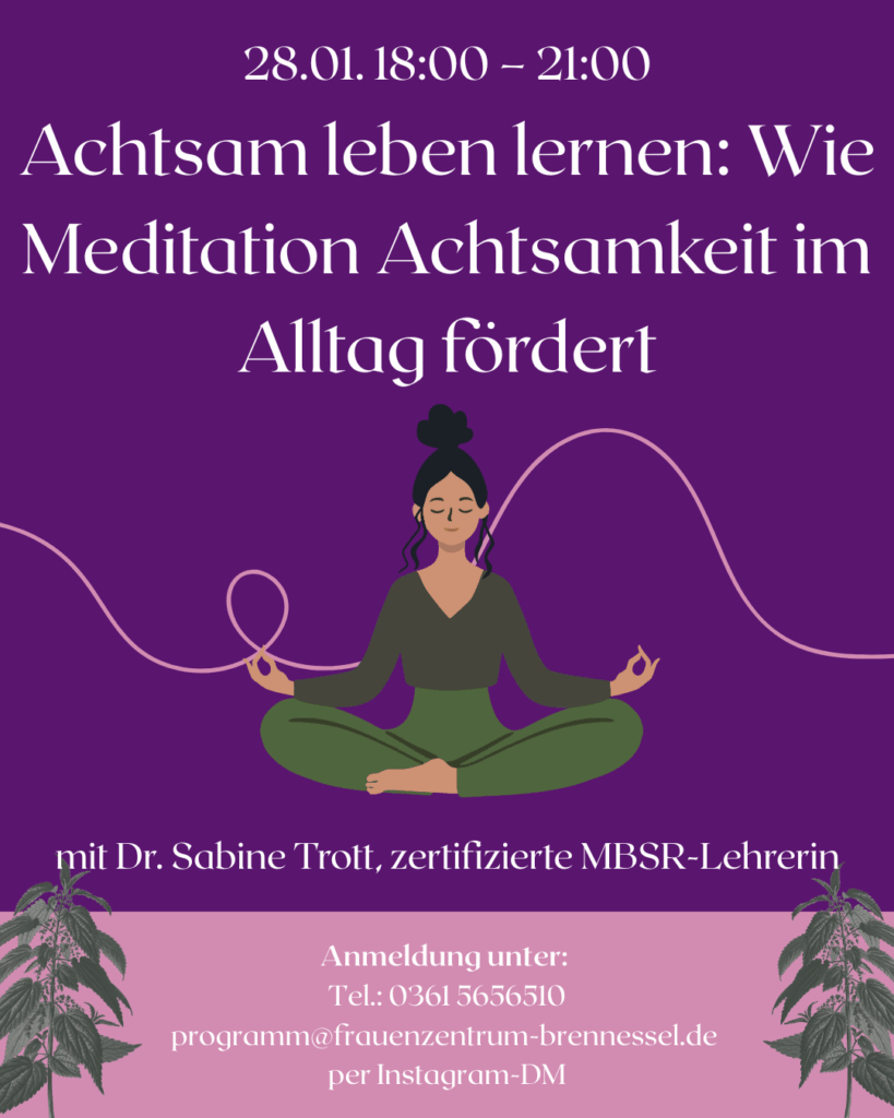 In diesem 3-Stunden-Workshop erhältst du eine verständliche Einführung in die Achtsamkeitsmeditation. Durch angeleitete Übungen und kurze Reflexionen erlebst du, wie formale Meditation deine Wahrnehmung schärft und dir hilft, dich selbst besser zu verstehen und im Alltag präsenter und gelassener zu handeln. Außerdem erfährst du, wie sich meditative Praxis und alltägliche Achtsamkeit gegenseitig stärken können und miteinander verwoben sind. Dozentin ist Dr. Sabine Trott, zertifizierte MBSR-Lehrerin (Mindfulness-Based Stress Reduction), www.ilmenau-achtsamkeit.de