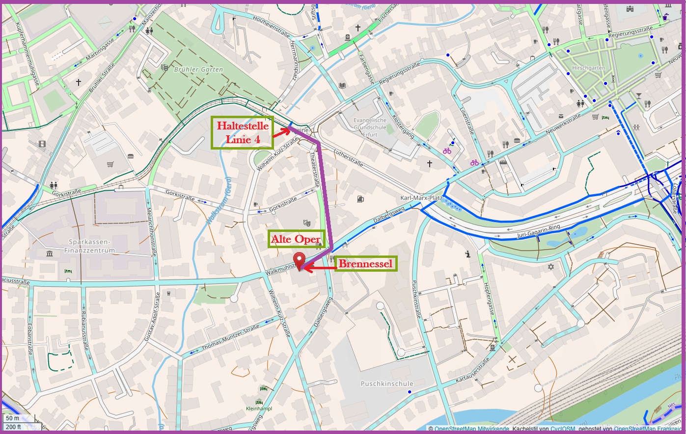 Mit der Straßenbahn 4 Richtung Hauptfriedhof/Bindersleben. Die dritte Station nach dem Angerkreuz an der Haltestelle „Brühler Garten“ aussteigen. Dann zu Fuß weiter in Richtung „Alte Oper“, an der Walkmühlstraße rechts halten und die Straße überqueren. rechts neben dem Kerzencafe befindet sich der Hauseingang. Hineingehen, links durch die Tür, dort befindet sich der Fahrstuhl. Sie finden uns in der dritten Etage.